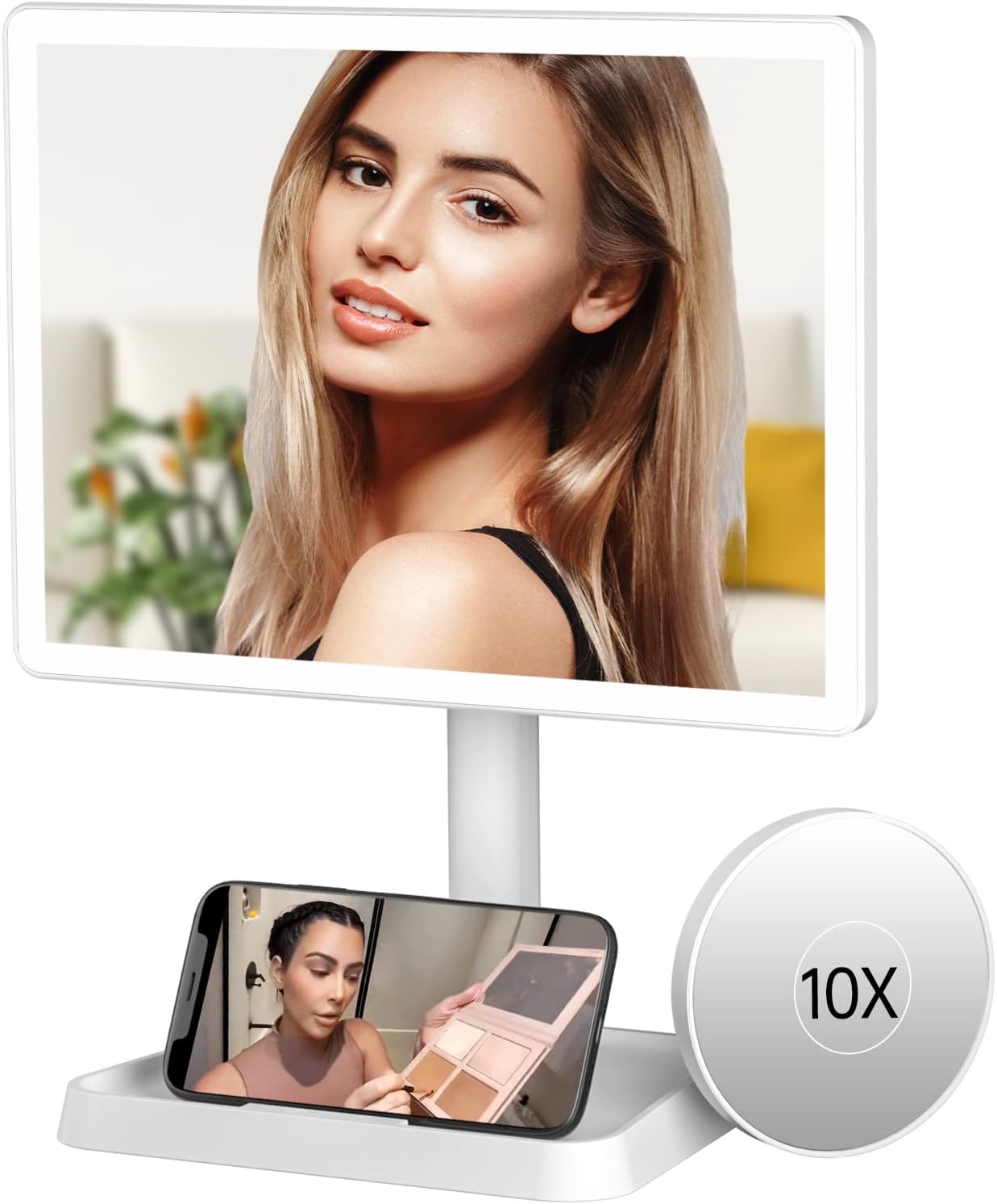 FUNTOUCH Rechargeable Makeup Vanity Mirror with Lights, Large Lighted Desk Makeup Mirror with 96 LED Lights and 10x Magnifying Mirror, 3 Color Lighting, Light up Make up Mirror with Phone Holder